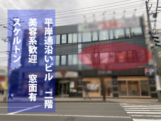 | 店舗詳細(抜粋) | ・平岸通り沿いビル2階 ・元美容系業種入居実績 ・現状はスケルトン ・自由度高い物件 ・大きな窓面有 …続きは詳細へ |