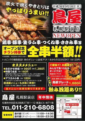 札幌市中央区南2条西10丁目藤栄ビルW棟1階で「やきとりS」さんがOPENしました!
