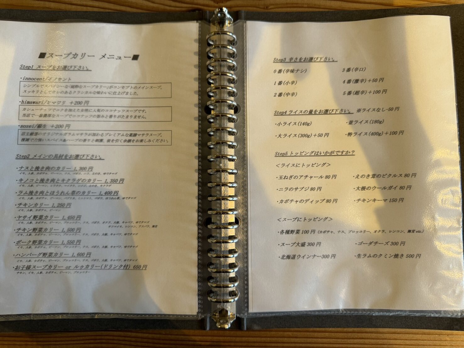 自分の好みを見つけれるのが、スープカレーの良い所。ベーススープ3種類、ラインナップも豊富、辛さも段階を選べて自分好みの商品を作れるのが良い所!